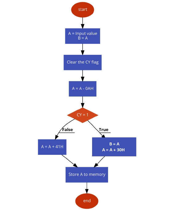 在程序中,我们首先清除进位标志。然后从给定数字中减去0AH。如果该值为数字,则减法后的结果将为负,因此进位标志将被设置。现在通过检查进位状态,我们可以简单地将30H与该值相加以获取ASCII值。