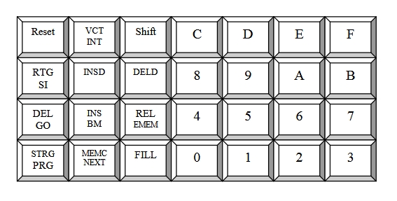 下表将显示不同控制键的功能。有16个字母数字键(0-9,A-F)用于提供数据和地址: