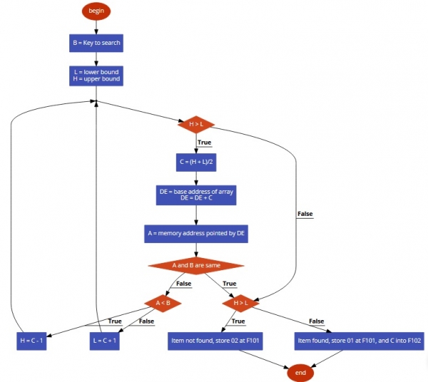 要执行二进制搜索,数组必须已排序。我们将下限放入L,上限放入H。数组位置存储在DE寄存器对中。中间值使用(H + L)/2计算。要执行此除法,我们只需将其右移一次。然后将中间值放入D并检查使用DE定位的项。如果数字相同,则跳转到结束并将1存储在F101。这表示找到该项,并将中间值存储为索引。如果中间值不匹配,则有两种情况,如果数字小于中间元素,则它位于下半部分,因此上限将为中间值-1,在另一种情况下,它将位于另一侧,因此下限将为中间值+1。如果未找到该项,它将在F101位置存储02。