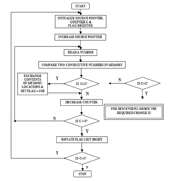 在这个程序中,我们将使用冒泡排序技术对数字进行排序。这种排序技术将执行多次传递。在每次传递中,最大的数字都存储在列表的末尾。这里我们从 8041H 到 8046H 获取数字。数组大小存储在 8040H 中。