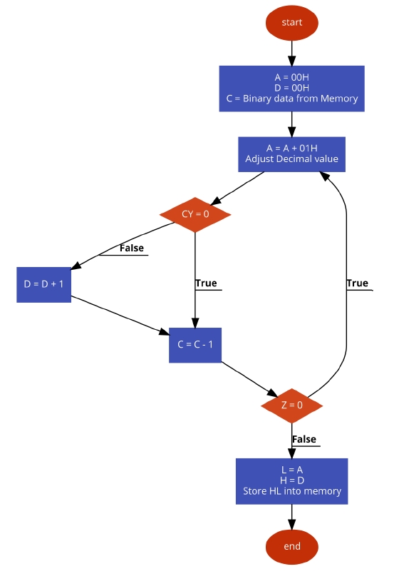 在这里,我们从内存中读取一个数字,并将其初始化为计数器。现在,在这个计数器的每个步骤中,我们将数字加1,并调整十进制值。通过此过程,我们找到二进制数或十六进制数的BCD值。