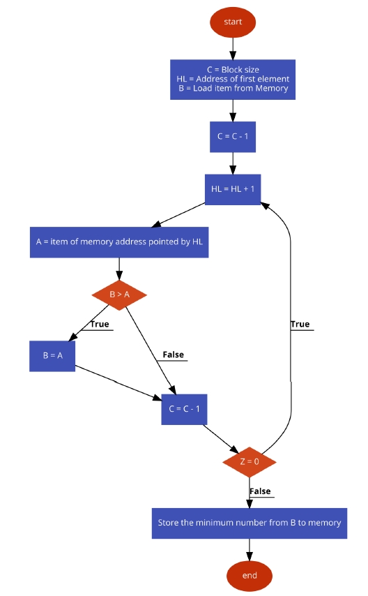逻辑很简单,我们将第一个数字存入寄存器B以开始工作。在每次迭代中,我们从内存中获取数字并将其存储到寄存器A中。然后,如果B > A,我们只需将B的值更新为A,否则继续进行下一次迭代。因此,我们可以找到字节块中的最小数字。