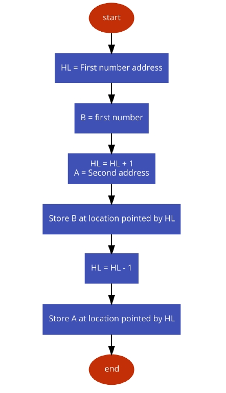 在本例中,我们使用HL对从内存中获取数字。HL对存储数据项的地址。我们将第一个数字加载到B寄存器,第二个数字加载到A寄存器,然后将B寄存器的内容存储到下一个位置,并将A寄存器的值存储到第一个位置。