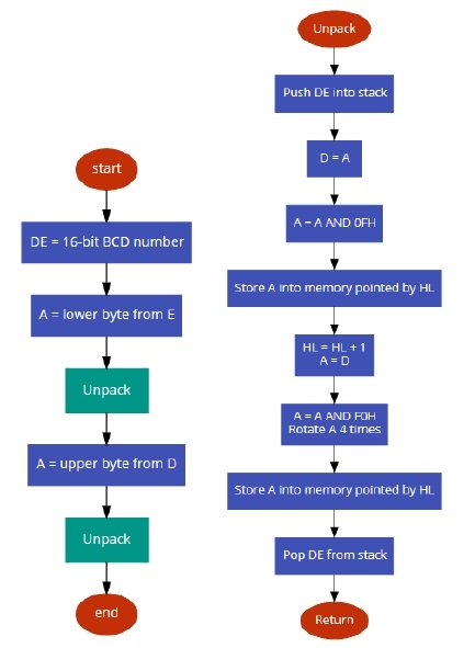 为了解决这个问题,我们将创建一个子程序,该子程序可以解压1字节BCD数并将其存储到内存中,然后我们将该子程序使用两次来存储16位数据。该子程序将通过掩盖高4位和低4位来分割数字,并将其存储到内存中。