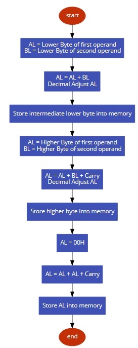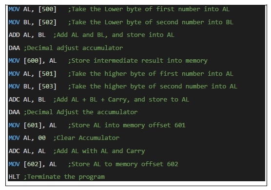 在这里,我们将逐字节相加 16 位数据。首先,我们相加低字节并执行 DAA 指令,再将高字节与进位相加,最后再执行 DAA 以调整。最终结果将存储在位置位移量 600H,如果出现进位,则将存储在 601H。