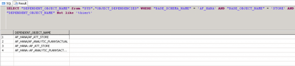 SELECT "DEPENDENT_OBJECT_NAME" from "SYS"."OBJECT_DEPENDENCIES" WHERE "BASE_SCHEMA_NAME" = 'AF_HANA' AND "BASE_OBJECT_NAME" = 'STORE' AND "DEPENDENT_OBJECT_NAME" Not like '%hier%';