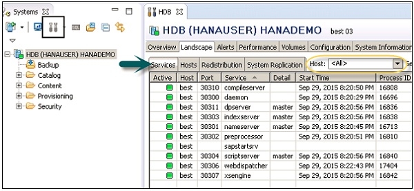 你可以在 HANA studio 中的“Landscape”选项卡查看 HANA 系统的概况。此服务显示 HANA 运行的所有服务。