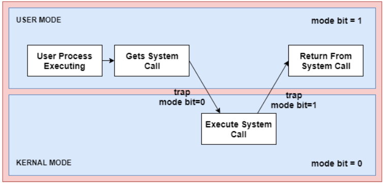 系统在启动时以内核模式启动,并在操作系统加载后,它以用户模式执行应用程序。某些特权指令只能在内核模式下执行。这些是中断指令、输入输出管理等。如果在用户模式下执行特权指令,则是非法的,并且会生成陷阱。