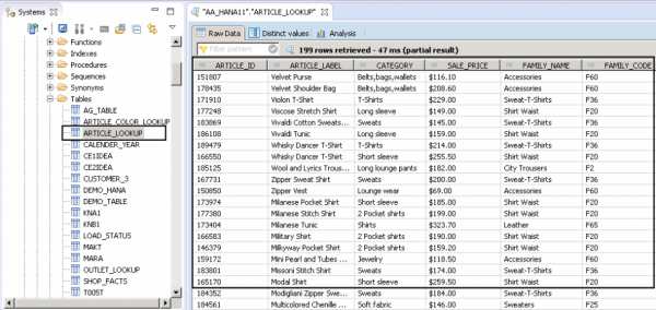 这将在所述模式中创建一个数据库视图,并且可以在视图文件夹中对其进行检查(此处的模式名称是 AA_HANA11)。您会看到一个名称为 view_Articlelookup 的视图,并且只有 4 个数据列。