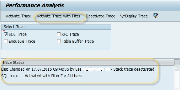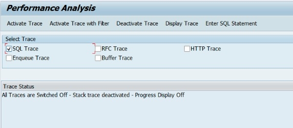 如果你无法获取所需信息,请使用 ST05 运行跟踪。在 SAP 系统中,开发人员使用 SQL 跟踪 (ST05) 来分析数据库 Select 语句。