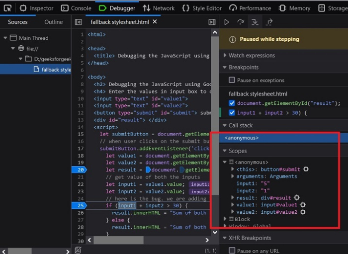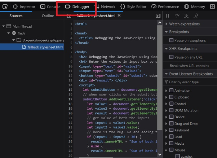<html> <head> <title> Debugging the JavaScript using FireFox. </title> </head> <body> <h2> Debugging the JavaScript using Firefox. </h2> <h4> Enter the values in input box to compare it. </h4> <!-- taking input strings from the user --> <input type = "text" id = "value1"> <input type = "text" id = "value2"> <button type = "submit" id = "submit">submit</button> <div id="result"> </div> <script> let submitButton = document.getElementById("submit"); // when user clicks on the submit button, we perform string matching operation. submitButton.addEventListener('click', function () { let value1 = document.getElementById("value1"); let value2 = document.getElementById("value2"); let result = document.getElementById("result"); // get value of both the input strings // here is the bug. we are converting one string to lowercase and another string to uppercase. let input1 = value1.value.toLowerCase(); let input2 = value2.value.toUpperCase(); try { if (input1 == input2) { result.innerHTML = "Both strings are equal." } else { result.innerHTML = "Both strings are not equal." } } catch (error) { result.innerHTML = "error occured." } }); </script> </body> </html>