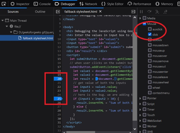用户可以通过单击该行号来在任何代码行设置断点。要为任何事件设置断点,用户可以转到第三部分的事件监听器部分,并为任何事件选择断点。在我们的例子中,我们将为鼠标单击事件选择断点,如下面的图片所示。用户需要选中单击事件的复选框。