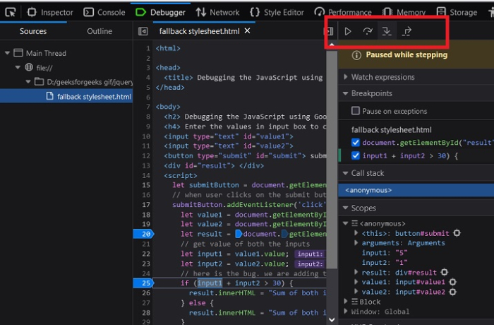 用户可以看到它从事件监听器的第一行开始调试。要逐行移动,请按下右上角的箭头按钮,如下面的图片所示。此外,