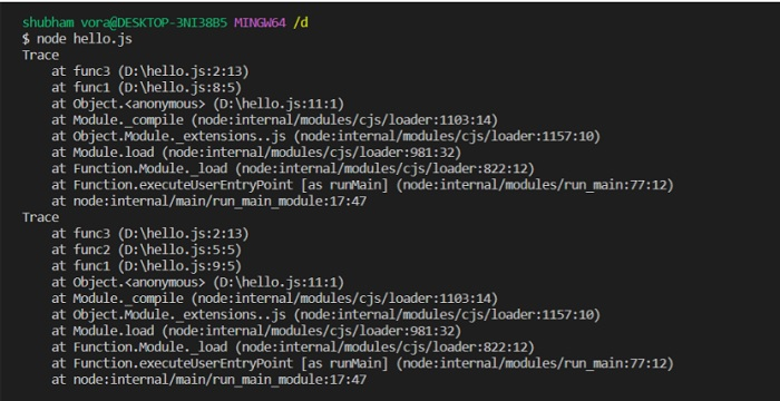 我们使用终端中的 Node Js 运行了上述代码。用户可以看到上面的输出。它清楚地显示,在第一个跟踪中,func3() 只从 func1() 调用,在第二个跟踪中,它显示 func2() 从 func1() 调用,而 func3() 从 func2() 调用。