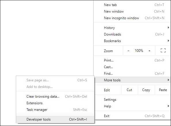 - 转到设置并单击更多工具。然后单击 开发人员工具。