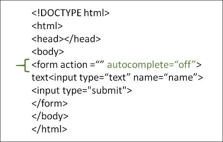 <!DOCTYPE html> <html> <head> <title> HTML autocomplete attribute</title> </head> <body> <form action = "" method = "get" autocomplete="off"> Details:<br><br> Student Name<br><input type = "name" name = "sname"><br> Training week<br><input type = "week" name = "week"><br> <input type = "submit" value = "Submit"> </form> </body> </html>
