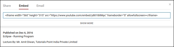 您可以尝试运行以下代码以了解如何使用 HTML 代码嵌入视频。复制如上所示的嵌入链接,并将其添加到 HTML 文档中