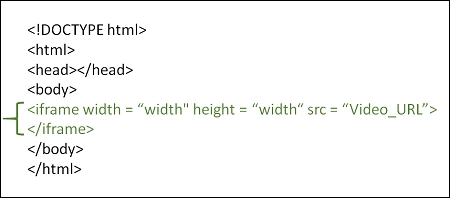 <!DOCTYPE html> <html> <head> <title>HTML Video embed</title> </head> <body> <p>Learn Eclipse</p> <br /> <iframe width="560" height="315" src="https://www.youtube.com/embed/y881t8ilMyc" frameborder="0" allowfullscreen></iframe> </iframe> </body> </html>