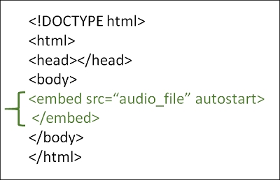 若要给网页添加背景音乐,使用 <embed>…</embed> 元素。同时,使用自动播放属性。这会在网页加载时在后台播放音乐。