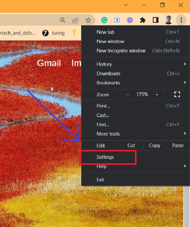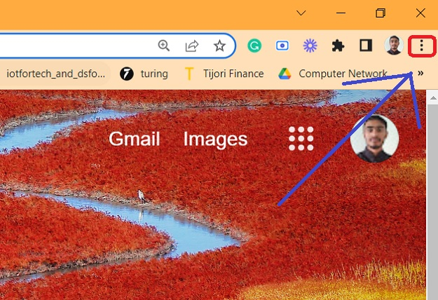 步骤 1− 打开您的Google Chrome浏览器并点击设置。在这里,您可以看到您需要点击屏幕右上角的三个垂直点。
