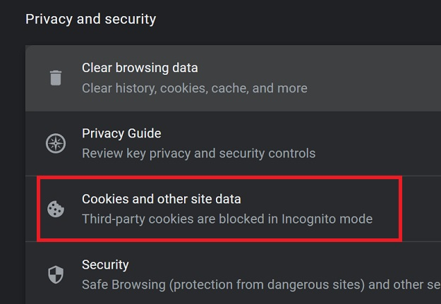 步骤 4− 隐私和设置页面打开后,我们需要点击 Cookie 和其他网站数据,如下所示。