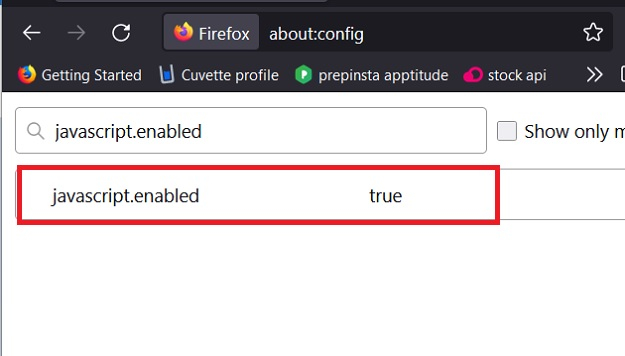 步骤 3 − 在页面顶部的搜索字段中,输入 javascript.enabled。在这里,您可以看到该值为 true,这表明 JavaScript 在浏览器中已启用。