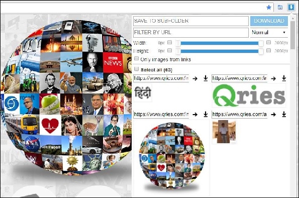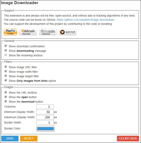 下载开源的 Image Downloader chrome 扩展程序。将其添加到 Chrome 后,您可以看到以下设置 −