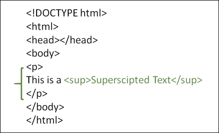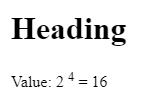 <!DOCTYPE html> <html> <head> <title>HTML text superscript</title> </head> <body> <h1>Heading</h1> <p> Value: 2 <sup>4</sup> = 16 </p> </body> </html>