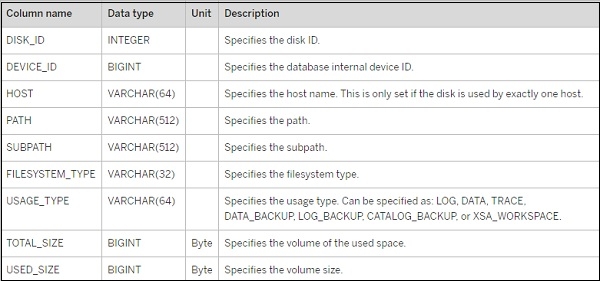 M_DISKS 系统视图用于提供有关磁盘配置和主机使用情况的信息。以下信息可用 −
