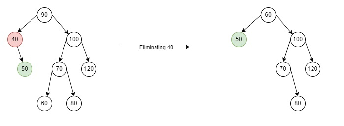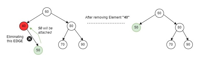 在上述情况下,我们尝试删除一个节点(40),该节点附加了一个子节点。如果要删除的节点只有一个子节点,它将复制该子节点到该节点并删除该子节点。