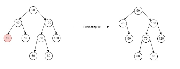场景 1 - 如果要删除的节点是叶子节点,则在这种情况下可以将其简单地从树中删除。