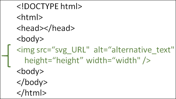 To add SVG files, you can use <img> <object>, or <embed> element in HTML. Choose any one of them according to your requirement. Here’s how you can add SVG,
