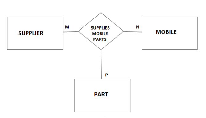 示例 - 考虑手机 M1 拥有部件 P1,并且它由多个供应商供应,在这种情况下,相对于手机和部件的供应商的基数为 M(多)。 - 类似地,对于给定的供应商实例和手机实例,供应商是否供应多个部件。
