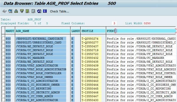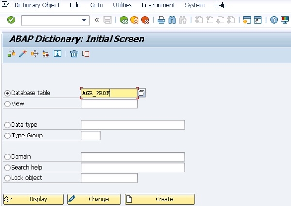 以使用 SE11、SE80 或 SE16 等相关 SAP 事务来进一步查看有关此表“AGR_PROF”及其内部数据,以下显示 SE11 T 代码 −