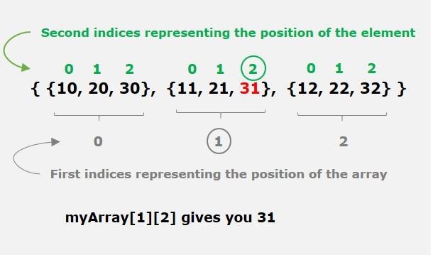 简而言之,二维数组包含一维元素数组。它由两个索引表示,其中第一个索引表示数组的位置,第二个索引表示该特定数组中元素的位置 −