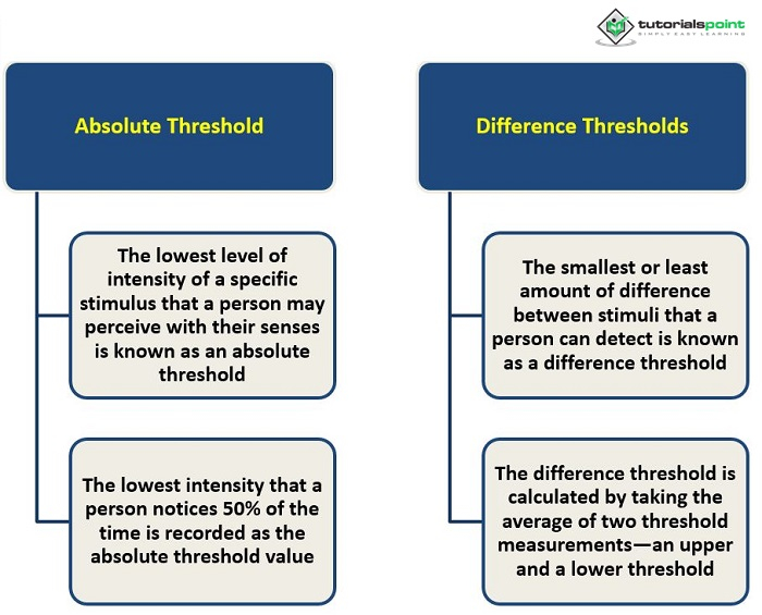 绝对阈限是指一个人可以通过感官感知的特定刺激的最低强度水平。差别阈限是指一个人可以察觉到的刺激之间的最小或最小差异。一个人在50%的时间内注意到的最低强度被记录为绝对阈限值。差别阈限是通过取两个测量值的平均值(上限和下限)来计算的。