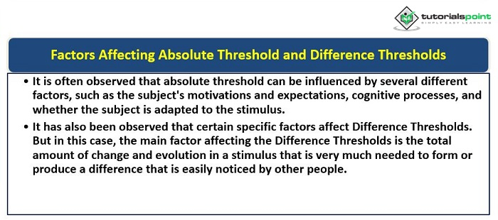 通常观察到,绝对阈限会受到几个因素的影响,例如受试者的动机和预期、认知过程以及受试者是否适应了刺激。在另一种情况下,也观察到某些因素会影响差别阈限。然而,在这种情况下,影响差别阈限的主要因素是刺激中所需的总变化量和演变,以形成或产生其他人容易注意到的差异。它可以是任何形式,无论是活的有机体还是非生物有机体。对于差别阈限,如果是有机体,则应与感觉同步。