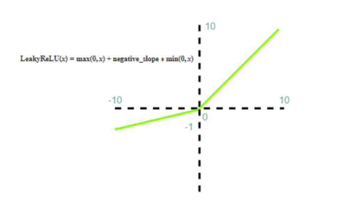 Leaky ReLU 激活函数类似于 ReLU 激活函数,但 Leaky ReLU 函数对于负输入不输出零,因此在负输入的情况下也会发生学习。Leaky ReLU 函数定义为LeakyReLU(x)=max(0,x)+negative_slope∗min(0,x)。Leaky ReLU 函数的图形如下所示。