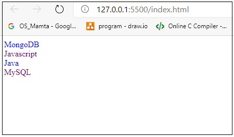</html>要运行以上程序,请保存文件名称 anyName.html(index.html),然后右键单击该文件,并在 VS 代码编辑器中选择使用实时服务器打开的选项。