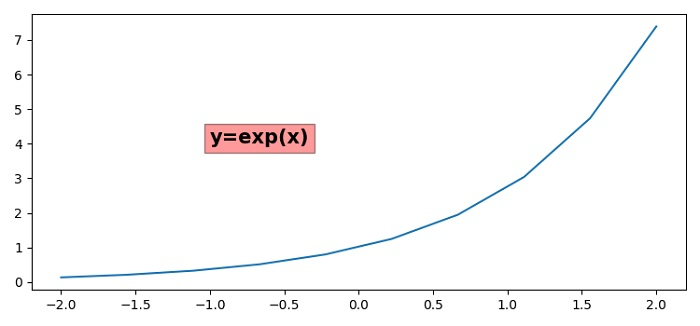 import numpy as np from matplotlib import pyplot as plt plt.rcParams["figure.figsize"] = [7.50, 3.50] plt.rcParams["figure.autolayout"] = True x = np.linspace(-2, 2, 10) y = np.exp(x) plt.plot(x, y) plt.text(-1.0, 4.0, 'y=exp(x)', fontdict=dict(fontsize=15, fontweight='bold'), bbox=dict(facecolor='red', alpha=0.4, edgecolor='black')) plt.show()