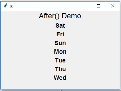 import random from tkinter import * base = Tk() a = Label(base, text="After() Demo") a.pack() contrive = Frame(base, width=450, height=500) contrive.pack() words = ['Mon', 'Tue', 'Wed', 'Thu', 'Fri','Sat','Sun'] #Display words randomly one after the other. def display_weekday(): if not words: return rand = random.choice(words) character_frame = Label(contrive, text=rand) character_frame.pack() contrive.after(500,display_weekday) words.remove(rand) base.after(0, display_weekday) base.mainloop()