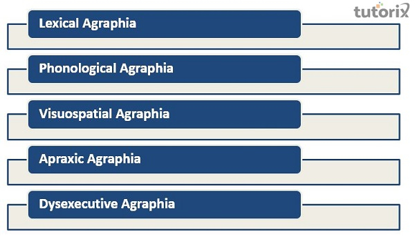 中枢性失写症是指由大脑语言、视觉或运动中枢功能障碍引起的书写能力丧失。中枢性失写症患者可能无法写出可理解的文字(取决于受损部位),他们的作品可能包含许多拼写错误或措辞不当。另一方面,周围性失写症是一种影响字母选择或书写过程的障碍,使阅读自己的笔迹变得困难。它可以根据书写过程中受损的部分进一步细分。一些最常见的失写症类型如下: