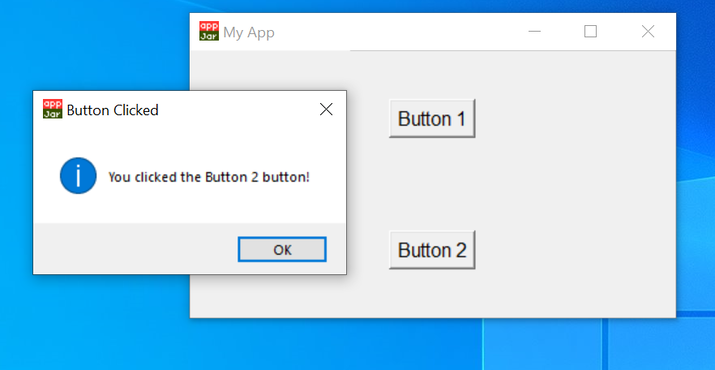 运行此程序时,它将创建一个带有两个按钮的 GUI 窗口。单击任何按钮都将显示一个带有按钮标签的信息框。