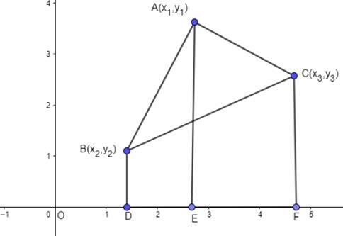 在此图中,从三角形的顶点到水平轴绘制了垂线AE、CF和BD。形成了三个梯形:BAED、ACFE和BCFD。