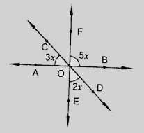 已知:$\angle BOF=5x, \angle AOC=3x, \angle DOE=2x$求解:我们需要求出 $x$ 的值。解:我们知道,对顶角相等。直线上各角的和为 $180^o$。因此,$\angle DOB=\angle AOC=3x$ (对顶角)$FOE$ 是一条直线。这意味着,$\angle BOF+\angle BOD+\angle DOE = 180^o$$5x + 3x + 2x = 180^o$$10x= 180^o$$x=\frac{180^o}{10}$$x=18^o$因此,$x = 18^o$。
