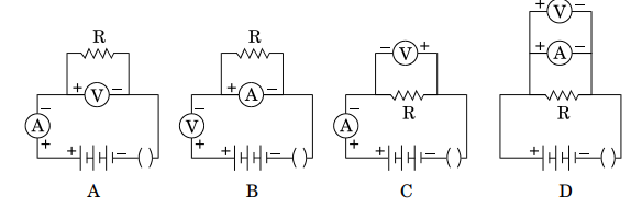 在给定的图中,研究电流对电阻两端电压依赖性的正确装置是选项 (c)。这是正确的,因为在这个测定电流对电阻两端电压依赖性的实验中,电压表与电阻并联连接,电流表与电阻串联连接。此外,电流表和电压表的极性标记正确。