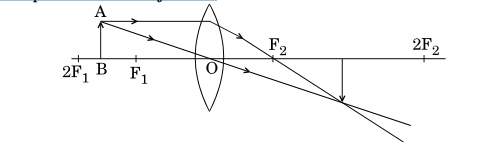 学生在追踪给定光线图时犯的两个错误是:1. 图像形成在错误的位置,因为如果物体放置在 2F₁ 和 F₁ 之间,则图像将形成在 2F₂ 之外。2. F₁ 不等于 F₂,2F₁ 不等于 2F₂。下图给出了正确的光线图,以显示与物体 AB 位置相对应的图像的真实位置和大小。图像位置 - 超过 (2F₂)(透镜后面)。图像大小 - 放大(放大)
