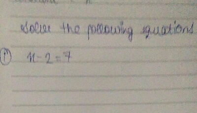 已知:方程 $n-2=7$。求解:解给定方程。解:如给定方程 $n-2=7$ $\Rightarrow n=7+2$ $\Rightarrow n=9$ 因此,$n=9$