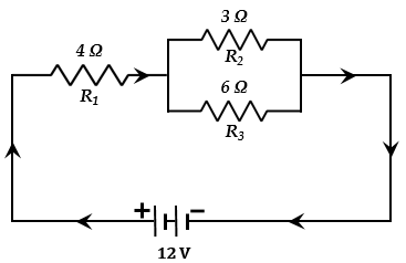 已知,电压,V = 12V电阻,R1 = 4Ω,R2 = 3Ω,R3 = 6Ω(i) 要找出电路的总电阻,我们需要将 R1 + R2 + R3 相加。如图所示,电阻 R2 和 R3 并联连接。因此,我们首先将 R2 和 R3 相加,它们的总电阻为:$\frac{1}{R}=\frac{1}{{R}_{2}}+\frac{1}{{R}_{3}}$$\frac{1}{R}=\frac{1}{3}+\frac{1}{6}$$\frac{1}{R}=\frac{2+1}{6}$$\frac{1}{R}=\frac{3}{6}$$\frac{1}{R}=\frac{1}{2}$$R=2\Omega $现在,这个电阻与电阻 R1 串联连接。因此,电路中的总电阻为:${R}_{T}={R}_{1}+({R}_{2}+{R}_{3})$${R}_{T}=4+2$ $\left[\because {R}_{1}=4\Omega \ and\ ({R}_{2}+{R}_{3})=2\Omega \right]$${R}_{T}=6\Omega $ 因此,电路的总电阻为 2 安培。(ii) 流经电路的总电流可以按如下方式计算:$I=\frac{V}{R}$,其中 I = 电流,V ... 阅读更多
