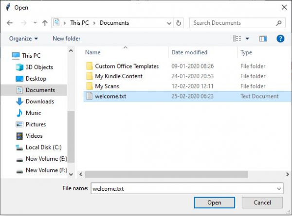 在下面的程序中,我们定义文件打开器函数。我们仅使用此函数打开一个文本文件,因为 Python 可以读取文本文件的内容,并且能够以更易读的方式将其输出。我们可以读取任何基于文本的文件,例如 .txt 或 .csv 文件。